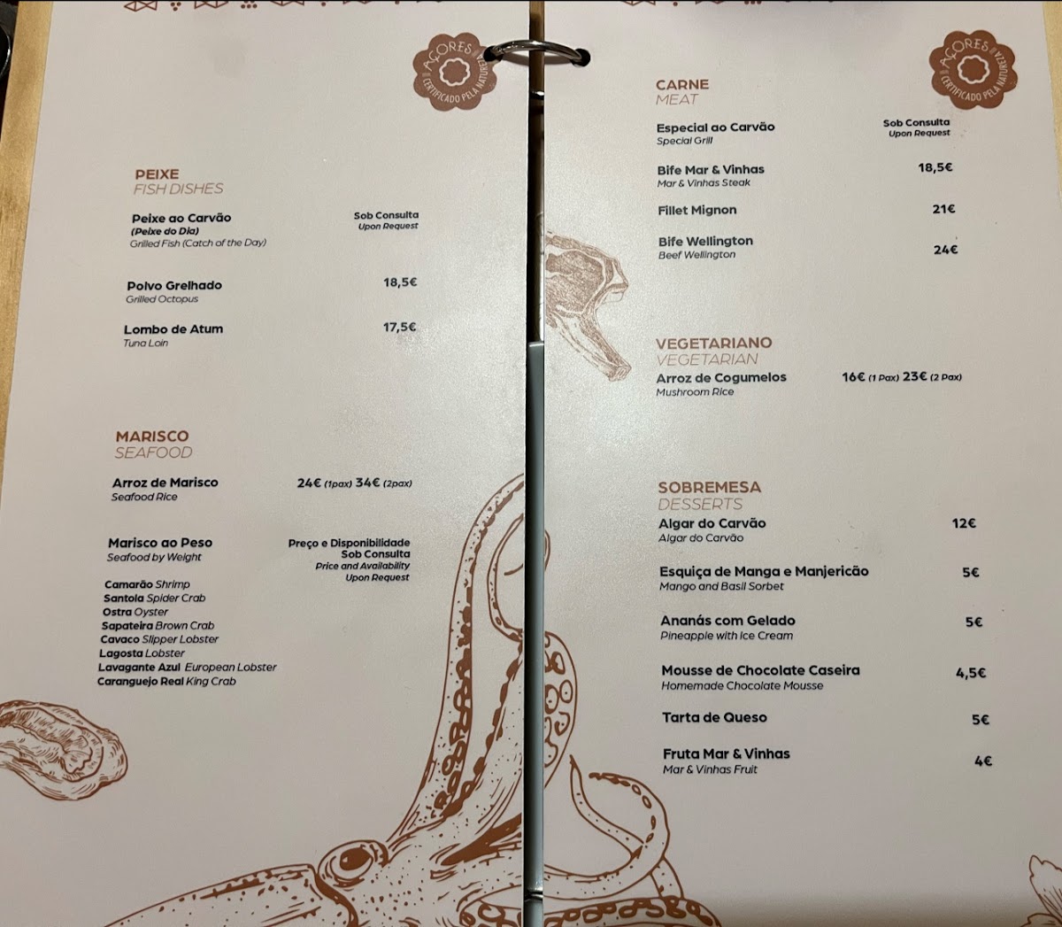 Nestled in the picturesque Biscoitos, Portugal, Mar & Vinhas offers a delightful culinary experience that beautifully marries the ocean's bounty with vibrant local produce. The menu features a curated selection of dishes, promising something for every palate, with standout offerings like the mar de bisque soup, tender freshly caught fish, and rich beef options. Vegetarian diners will enjoy the flavorful mushroom rice dish.